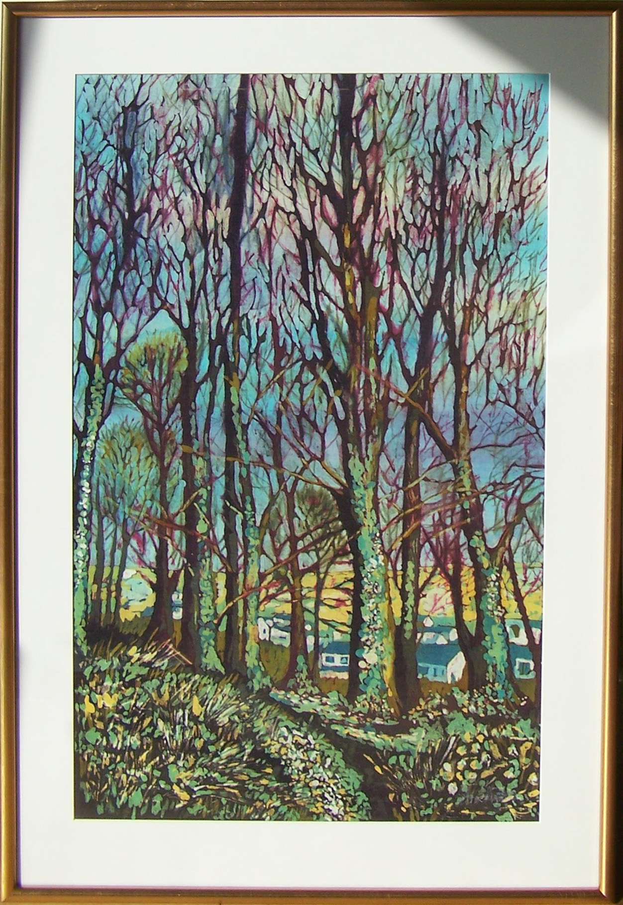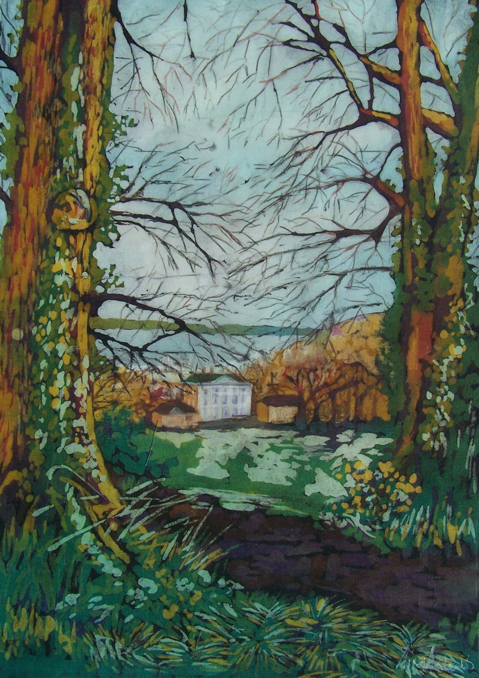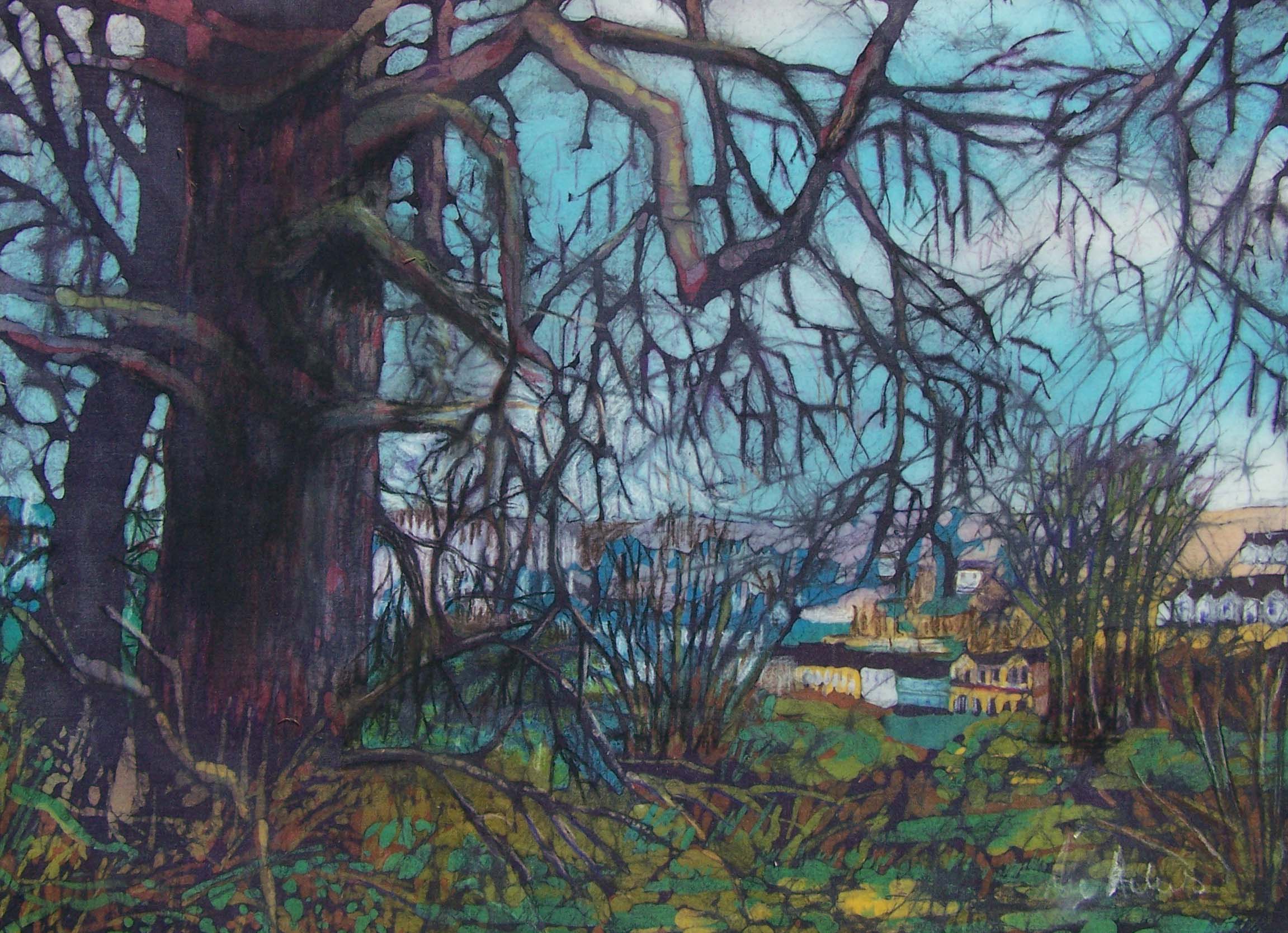 The railway walk meanders along by the waterside and the boats of Drakes Pool but the winter trees with views of the village and the houses seen through the tangle of the bare branches in the woodlands around Templebreedy became the main inspiration for my workthat year.